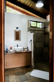 Our Pura Vida Jungle house is our largest ,most luxurious and private bungalow . With accommodation of up to 5 guests across 2 rooms via 1 queen bed and 3 singles, it is ideal for a couple or a family group that is comfortable staying together. Two custom bathrooms, a private covered car park and a large covered teak deck for gathering ,relaxing and viewing the active jungle make this a perfect option for those seeking an unique Costa Rica experience. Breakfast is served daily on your deck.